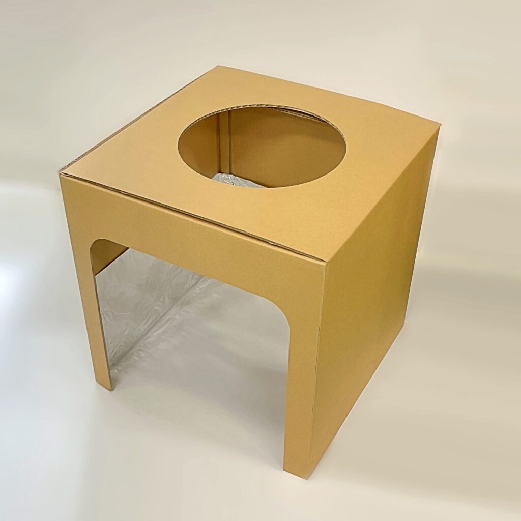 こちらはタマゴが飛び散らないようにダンボールで作製した『たまご落とし機』です。