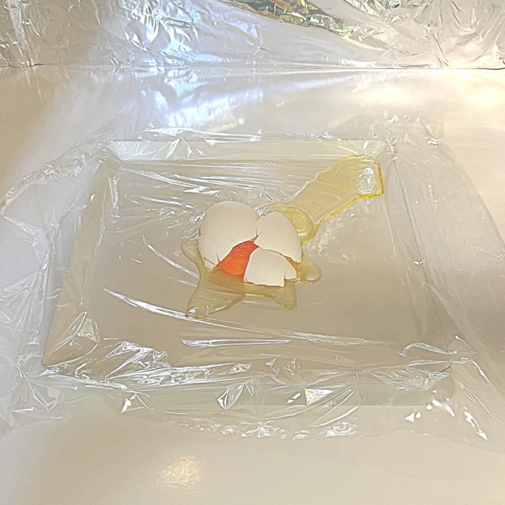 割れた場合に、タマゴが食べられないのは困るのでラップを一枚引いています。