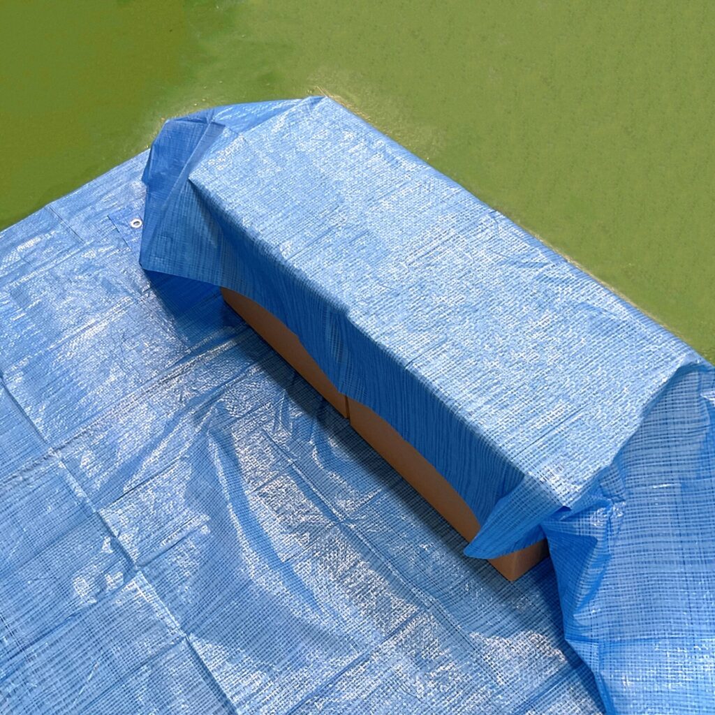 段ボールが濡れないようレジャーシートなどで包み込みこれを玄関などの出入り口に置き対策します。庭先のホースなどで水を入れれば持ち上げなくもできるので老若男女問わず人手がなくとも簡単に作れます。